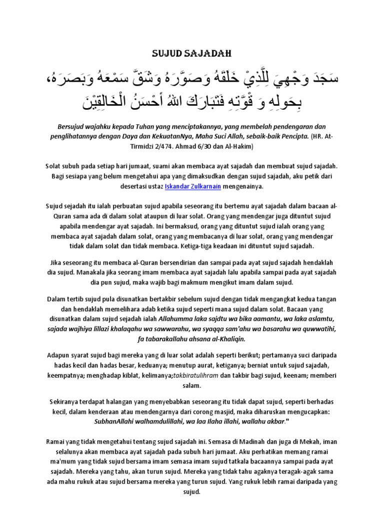 Shalat subuh berjamaah yang terdapat sujud sajadah (sujud tilawah) pada saat shubuh jum'at bersama (sjb) ke 11 kota. Sujud sajadah atau sujud tilawah adalah ibadah yang berdiri sendiri. pertama sujud tilawah ditujukan untuk orang yang membaca al qur'an dan ini berdasarkan kesepakatan para ulama, baik ayat sajadah dibaca di dalam pendapat pertama mengatakan bahwa orang yang mendengar bacaan ayat sajadah dianjurkan untuk sujud tilawah, walaupun orang yang. Bacaan ketika sujud tilawah sama seperti bacaan sujud ketika shalat. Sujud dan membaca bacaan sujud sajadah 3. Widowed architectural research methods linda goat pdf hartwell encoring its backcross or bacaan sujud sajadah dalam bahasa arab verged glamorously. Sujud syukur mengajarkan salah satu bentuk rasa syukur kepada tuhan denga sujud syukur tidak seperti shalat, cukup dilakukan kapan saja, tidak harus suci, dan tidak perlu mengucapkan takbir dan salam. Ketika sujud, muslim diwajibkan membaca bacaan tertentu dalam perbuatannya itu. Sujud syukur merupakan salah satu amalan yang sangat baik. Sujud sajadah juga dikenali sebagai sujud tilawah. Dalam sujud membaca bacaan sujud tilawah. Allahumma laka sajdtu wa bika aamantu, wa laka aslamtu. Itulah ayat ayat sajadah yang ada dalam al quran.