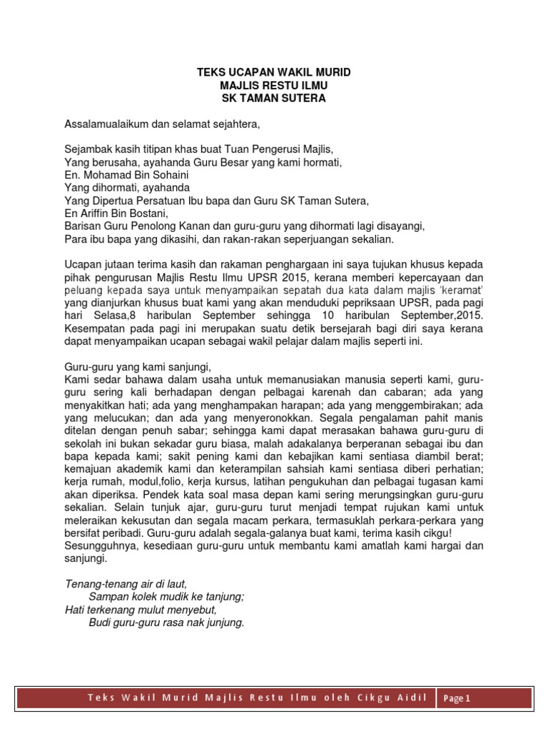 Ucapan wakil dari pelajar kvt indigo awani pagi: Teks pengacara majlis sempena persaraan timbalan pengarah masa cue ann 1:50 ptg ketibaan siswa pendidik mohon perhatian: Ucapan takziah, ucapan kematian, ucapan orang meninggal, ucapan org meninggal. Teks ucapan wakil pelajar docx document. Teks ucapan wakil pelajar sempena sambutan hari gurubismilahhirahmanirahim. Assalamualaikaum dan selamat sejahtera, (baca basmallah dan selawat nabi). Ucapkan mulai mendengarkan atau klik tombol mikrofon untuk memulai mode mendengarkan. Kesempatan pada pagi ini merupakan suatu detik bersejarah bagi diri saya kerana dapat menyampaikan ucapan sebagai wakil pelajar dalam majlis pelerahan ilmu ini. Ucapan wakil pelajar sempena persaraan guru besar. Pengerusi puspanita jajahan gua musang. Teks ucapan guru bertugas mingguan. Assalamualaikum w.r.b.t dan selamat pagi. Teks majlis kuarter master teks ucapan majlis kuarter master.